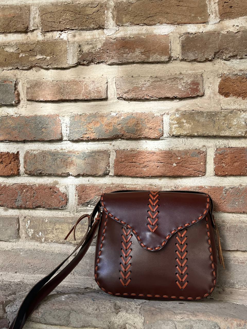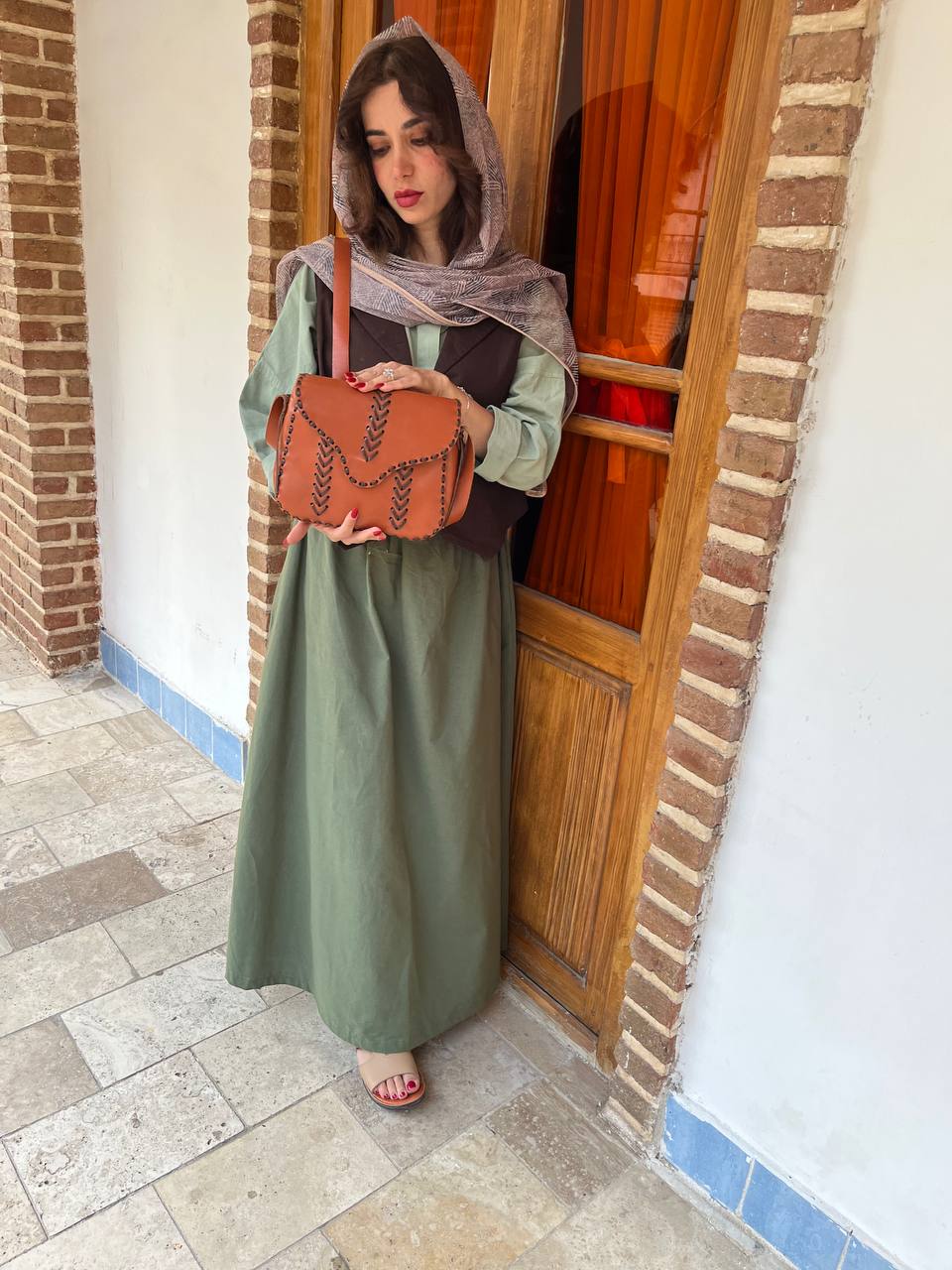 خرید کیف دوشی گندمی چرم گاوی دست‌دوز | طراحی شیک و دوخت تریشه